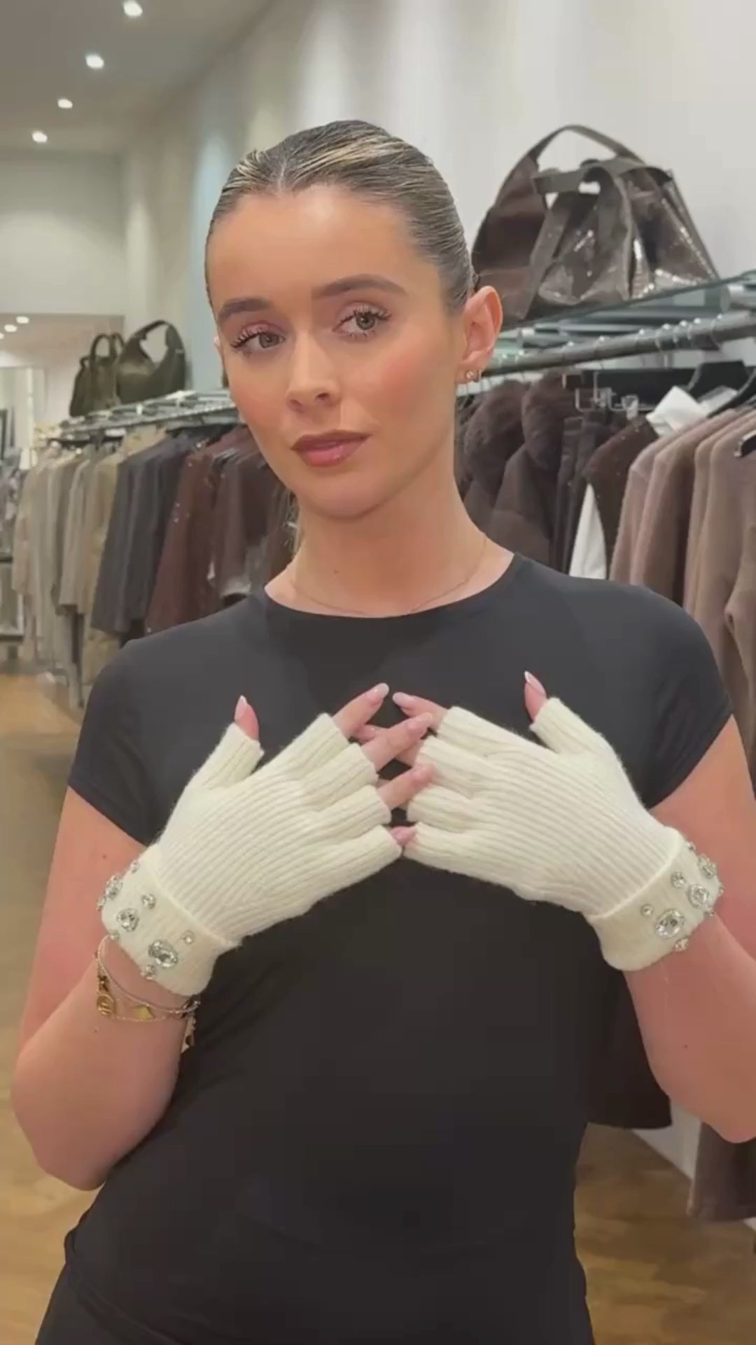 Keep your hands warm whilst maintaining dexterity with the Rhea Gemstone Fingerless Gloves. Crafted from soft knitted fabric with delicate gemstone embellishments adorning the cuffs, these elegant fingerless gloves are designed to bring warmth, functionality, and refined charm to your autumn and winter accessories.